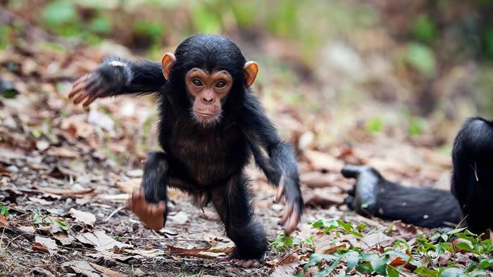 当黑猩猩直立行走时,它们利用一种不太高效的曲腿步法。这和人类的直腿行走不同。 图片来源:KONRAD WOTHE/MINDEN PICTURES