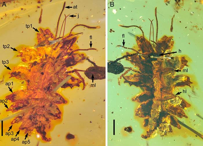 本次报道的昆虫为脉翅目草蛉总科的幼虫,俗称蚜狮。该物种被命名为黄氏拟苔草蛉,种名以模式标本的捐赠人(台湾黄憶人先生)命名。拟苔草蛉与目前已知的所有草蛉总科幼虫不同,其胸部及腹部前5节背板发育了共8对扁阔的叶状结构,其外形非常类似于苔藓的植物体。此外,该种头部相对退化并隐匿在前胸侧叶下,前端发育有一对极长且端部膨大的触角以及一对细长内弯的大颚,分别用来探测和捕食猎物。