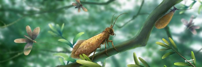 结构色的成功复原,也让王博等人意识到,蛾类在很早之前就演化出了颜色,可能用于吸引异性之类的生物交流。这样的推测让他们畅想了一场发生在2亿年前的蛾类“艳遇”——在2亿年前的侏罗纪,一个夏日的午后,在湖边树林里,骄阳穿过一棵棵耸入天际的松柏树的繁枝,洒下一片暖暖的阳光,一只雄蛾扇动着“土豪金”色的薄翼悠哉地闲逛。突然,它被一只雌蛾吸引。两情相悦一番亲热后,雄蛾抵不住体能的消耗,直直地掉下树枝,跌入湖中。恰巧的是,它被湖底的淤泥包裹,身上的金色薄翼成为化石,被永久地保存了下来,直到被现代的科学家发现。