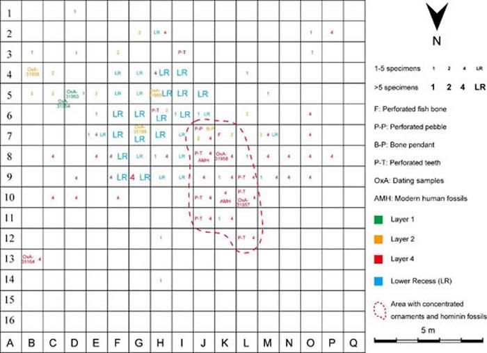山顶洞遗址人类化石、文化遗物及测年样品平面分布图