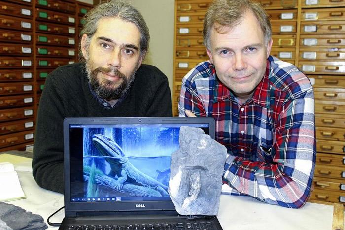 该化石是由鱼类进化而成的四足动物。 图为画家绘画的想像图。
