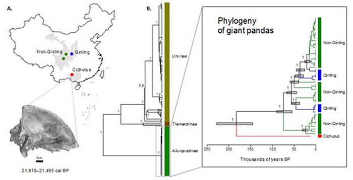 慈竹坨大熊猫样本的发现位置与其颅骨的计算机断层扫描图(A);大熊猫的线粒体系统发育图,从所有熊科物种的系统发育中扩展,表明其独特的线粒体谱系及与现存大熊猫种群在约18.3万年前拥有共同祖先(B)(图片来自原文)