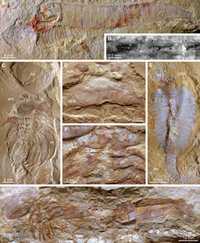 图版说明:昆明寒武纪小石坝化石库的抚仙湖虫类。A-D, Chengjiangocaris kunmingensis: A, B, 保存有腹神经索(深浅色相间链条状结构)和纤细的外缘神经(pn);C, D, 密集的附肢,蝶形口板及食物沟。E, Fuxianhuia xiaoshibaensis具铰连背甲及残留的特化触角后附肢(SPAs)。F, G, Alacaris mirabilis显示头部由口板、膨大特化的附肢基节组合形成的口器。