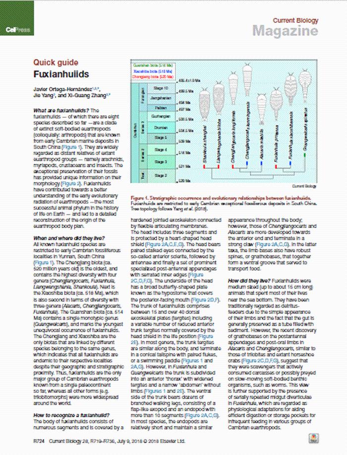 (化石网报道)据云南省古生物研究重点实验室:7月9日,美国《细胞》出版集团子刊《当代生物学》(IF: 9.251)在线发表了云南大学云南省古生研究重点实验室张喜光、杨杰老师与剑桥大学Javier Ortega-Hernández博士共同完成题为“抚仙湖虫类”(Fuxianhuiids)的综述快讯。
