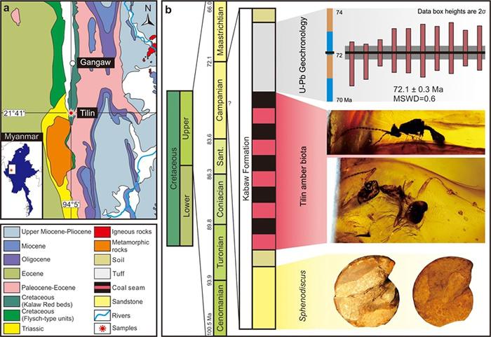 由于各种原因,地质学家很难赴缅甸琥珀原产地进行详细的现场考察,对缅甸地区琥珀矿的基础地质资料了解的非常有限。近几年,南京古生物所“现代陆地生态系统起源与早期演化研究团队”的郑大燃博士、王博研究员等多次对缅甸琥珀矿进行了地质考察。近期,该团队与香港大学、英国、法国和印度等科研人员合作,在缅甸中部马圭省提林地区发现了一个新的琥珀生物群——提林琥珀生物群。通过对含琥珀地层进行详细的放射性同位素年代学和生物地层学年代限定、琥珀的成分分析以及内含物研究,确认提林琥珀生物群的时代为晚白垩世晚期(7200万年前)。