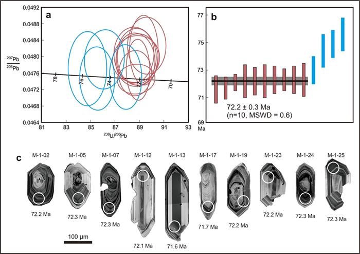 研究团队经过实地调研,发现提林琥珀保存在一套煤矸石中,其上覆盖有一层凝灰岩。团队成员对采集的凝灰岩处理并在激光剥蚀多接收电感耦合等离子体质谱仪(LA-MC-ICP-MS)上进行年代学测试。凝灰岩中分离出来的锆石具自形、环带特征,反映了其岩浆岩来源和未经明显搬运沉积特征。在随机选择的25颗锆石中有15颗协和度> 98%,用来决定凝灰岩的沉积时代。其中10颗具最年轻年龄的锆石给出的加权平均年龄为72.1 ± 0.3 Ma (MSWD = 0.6),表明凝灰岩的沉积时代接近坎潘期-马斯特里赫特期界限,为下覆琥珀生物群提供了坎潘期最晚期时代限定。此外,研究团队在琥珀层之下砂岩中发现结核保存的菊石,这些菊石被鉴定为Sphenodiscus属。Sphenodiscus最早可能出现于坎潘期晚期,并在马斯特里赫特期广泛分布,为提林琥珀提供了坎潘期晚期-马斯特里赫特期的时代下限。结合放射性同位素年龄和菊石的时代,提林琥珀时代应为坎潘期最晚期。因而,提林琥珀的时代要比克钦琥珀年轻至少2700万年。