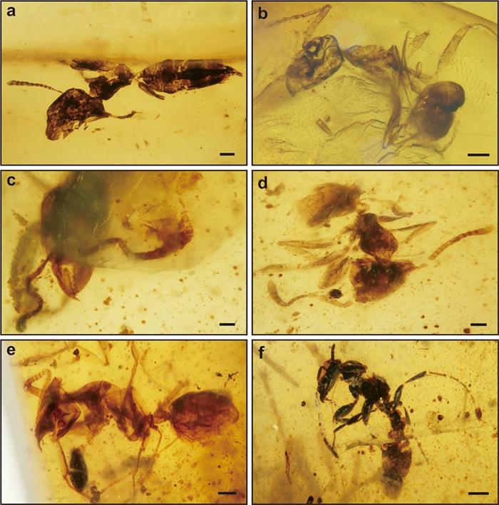 提林琥珀透明到半透明,以红、黄色为主,琥珀原石尺寸很少超过10厘米。研究团队采集了5公斤琥珀原石,经过打磨抛光处理从中发现大量节肢动物和植物内含物,且以昆虫化石为主。昆虫化石包括至少8目12科,以膜翅目和双翅目为主,多数是白垩纪常见的昆虫分子。其中最为重要的发现是7枚现生亚科蚂蚁化石。