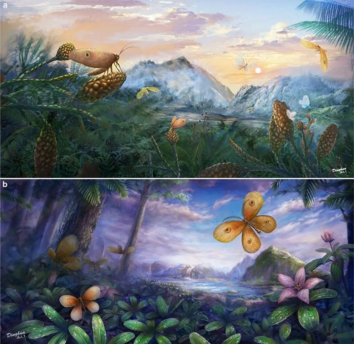 侏罗纪和白垩纪丽蛉的生态重建图(杨定华绘图)