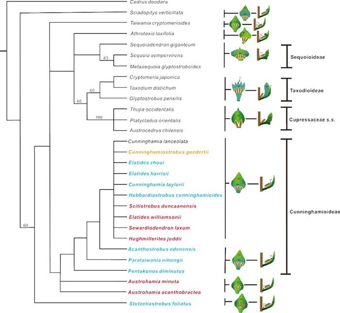 重建的柏科系统发育树(左侧)及柏科苞鳞复合体示意图(右侧)