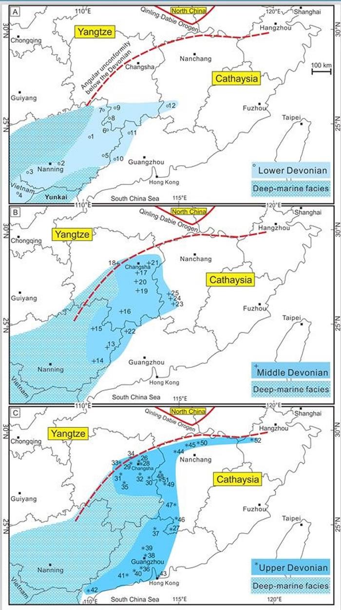 (化石网报道)据中国科学院南京地质古生物研究所:古生代时期,华南在古地理上位于冈瓦纳大陆的东北边缘,是由华夏和扬子两个陆块在新元古代时期拼合而成,两个陆块之间分布有广泛的陆表海。华南古生界地层中最重要的构造界面就是泥盆系与其下覆寒武系—志留系不同层位地层之间的大间断,其表现为地层间的角度不整合或平行不整合接触。这些不整合接触面是华南泥盆系以及下覆地层最显著的识别特征,是从事地层学和古生物学野外工作的重要参照,其在构造地质学上被解释为广西运动的结果。已有学者通过奥陶纪岩相和生物相的分析开展了华南广西运动的进程以及相关的构造运动等研究工作。然而,对于广西运动之后,华南的海侵以及接受沉积的过程鲜有研究,相关的研究工作离不开华南的泥盆纪植物化石以及相关的浅水沉积记录。