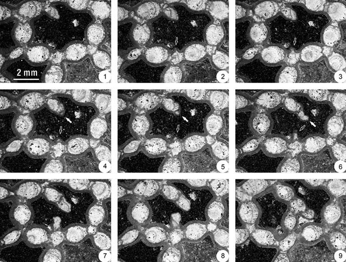 为了深入研究横板珊瑚系统分类与演化中的疑难问题,中国科学院南京地质古生物研究所梁昆博士联合国外珊瑚化石专家,对15块采自爱沙尼亚特列奇期和申伍德期的链珊瑚化石标本开展了详细研究。通过形态测量学分析方法并比较已报道的链珊瑚种,鉴定出所有采集标本均为链珊瑚属的模式种Halysites catenularius。在此基础上,运用间距仅为0.05毫米的醋酸纤维素薄膜揭片技术制得约5000枚薄片,从而实现了对珊瑚生长过程的观察与复原。