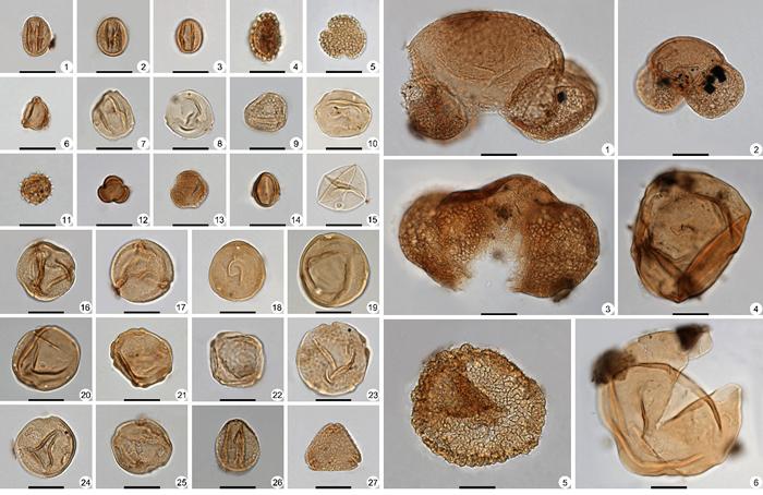 近期,由中国科学院南京地质古生物研究所王伟铭研究员领导的研究团队,依据嵊县组分布范围内火山岩带的划分,对该套地层不同分布点开展了系统的野外采样和孢粉分析工作。在全面整理前人研究成果和广泛对比邻区孢粉序列的基础上,建立了浙江东部中新世孢粉组合序列——早中新世晚期至中中新世早期的“栎属(常绿型)—枫香属—山核桃属”孢粉组合,中中新世晚期至晚中新世早期的“栎属(常绿型)—松属—(禾本科)—菱属”孢粉组合,以及晚中新世晚期的“栎属(常绿型)—水青冈属—蒿属”孢粉组合。