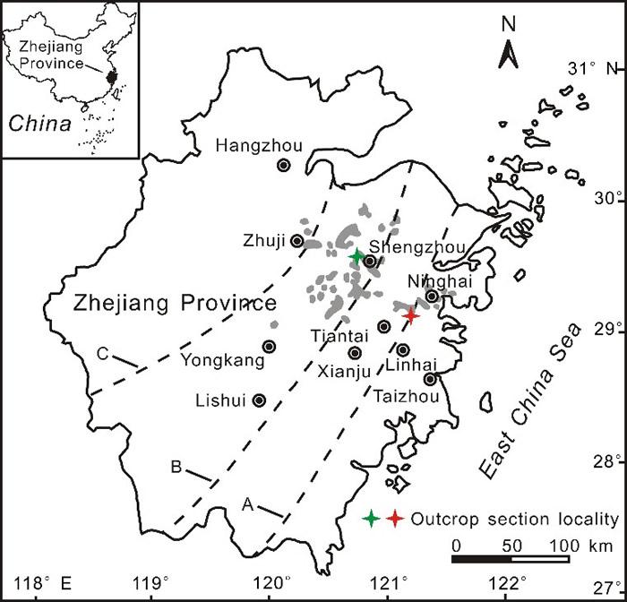 分布于浙江东部的嵊县组,是一套由多旋回喷发的玄武岩和河湖相沉积组成的地层,其中的河湖相沉积是我国新近纪植物大化石最好的产出层位之一。已有的同位素年代学研究显示,与嵊县组相关的火山活动发生在晚中新世至第四纪最早期;植物大化石通常指示中新世。由于这些沉积层多以玄武岩沉积夹层出现,或是形成于小型断陷盆地和因熔岩堵塞山谷而形成的堰塞湖盆中,分布零星且厚度小,相互之间的对比比较困难,因此,以往的工作大多缺乏系统性。