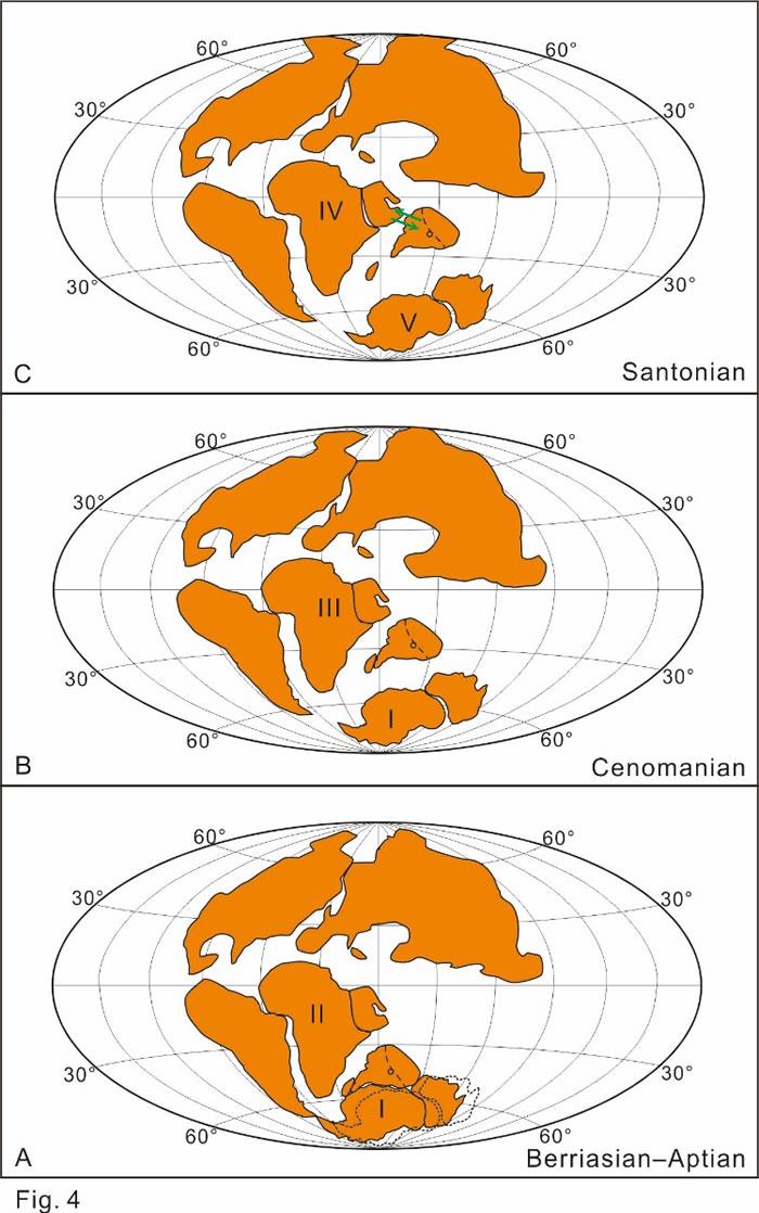研究发现印度板块在早白垩世早期与澳大利亚的孢粉植物群高度一致,但从早白垩世晚期的Albian期开始两者之间的差异越来越明显,反映两个陆块已经分离。从晚白垩世Cenomanian期开始,印度板块的孢粉植物群展现出与澳大利亚和非洲完全不同的特点,反映了印度板块作为一个被海洋孤立的板块开始了向北漂移的历程。在晚白垩世晚期Santonian期,印度板块北缘开始发育了非洲北部特有的孢粉属种,指示此时印度板块已经从南半球中高纬度漂移至了赤道区的非洲北部附近,非洲北部和印度陆块之间的陆生植物已经可以进行交流。