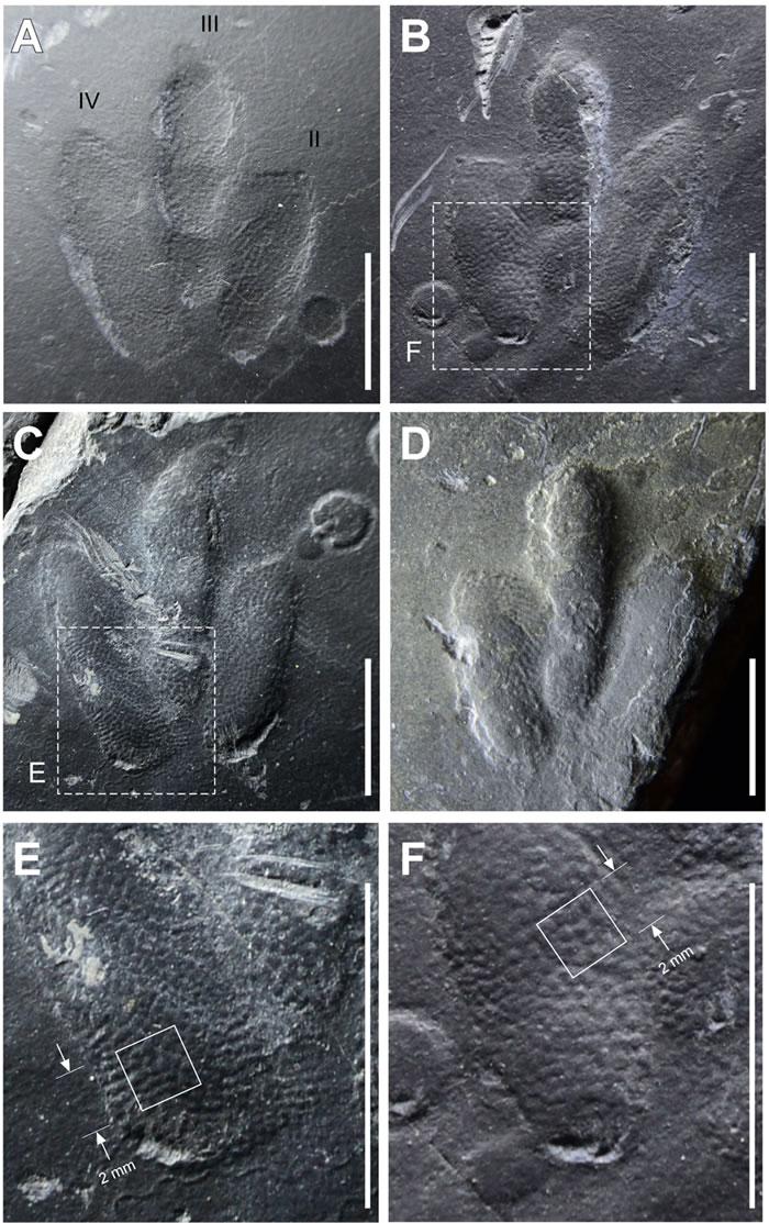 古生物学家从未发现过如此完美的皮肤印痕,足迹上的鳞片痕迹平均直径还不到0.4毫米。而且,不同于此前的鳞片印痕仅出现在足迹的部分区域,小龙足迹保存了整个脚底的皮肤。