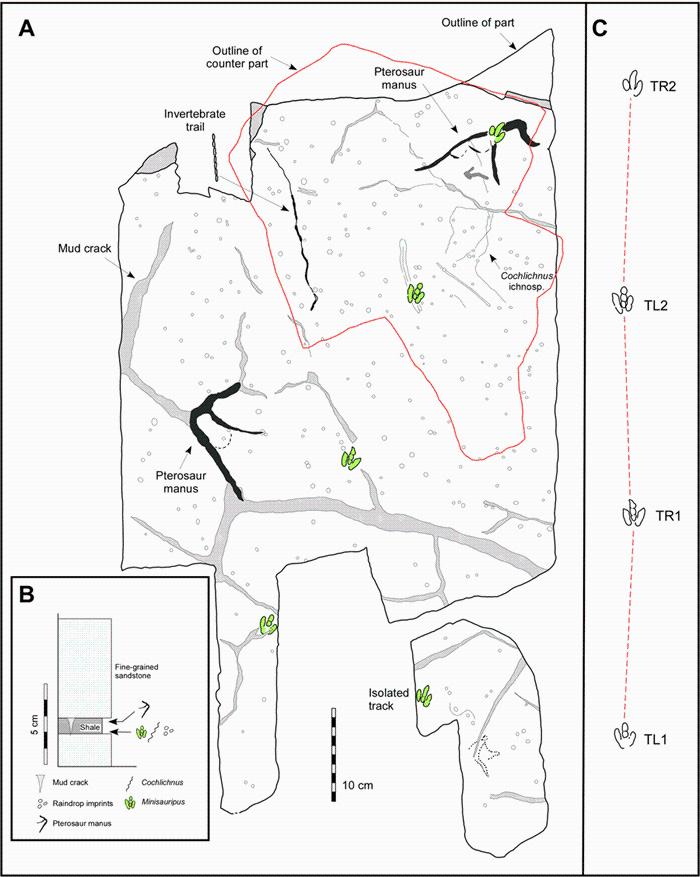 为什么这些皮肤印痕保存得如此完好?马丁·洛克利教授解释说,足迹是在非常薄的一层细泥上留下的,它就像一层厚度仅为一毫米的新鲜涂料,涂在坚硬的地面上。当乌鸦大小的小龙踩在这个粘性地面时,脚底的鳞片纹理得到了完美的复制。