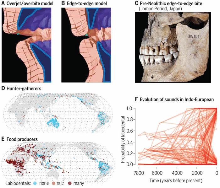 通过包括对不同人类口面部构造进行详细的生物力学模拟等研究,Blasi和同事证明,成人牙齿结构的保持其上齿相对于下齿的略微靠前的变化(这一变化与诸如工业化碾磨等食物加工技术的出现时间吻合)导致了一类新语音的出现。这类被称作唇齿音的声音如今出现于半数的世界各种语言中;唇齿音是通过将下唇与上齿接触而产生的。例如当发字母“f”音时就会产生唇齿音。作者说,唇齿音的使用仅在最近几千年中有了急剧的增加,即在农业得到发展之后。