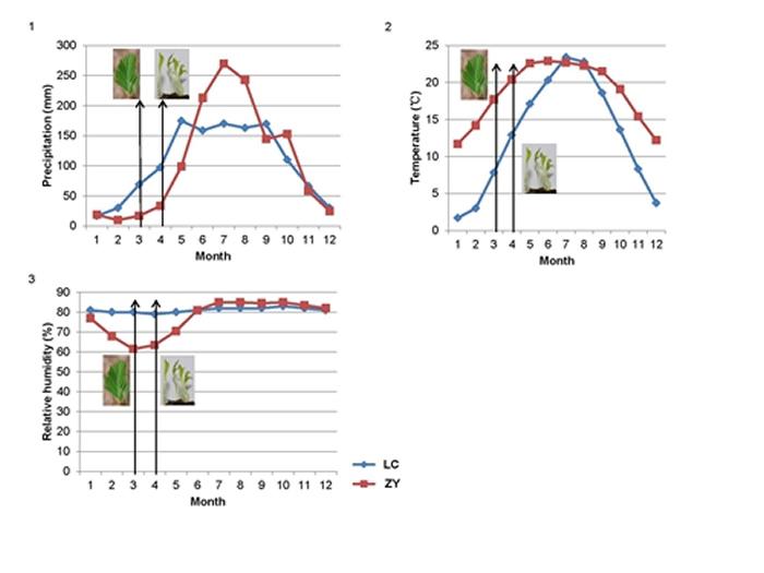 云南镇沅(ZY)和湖北利川(LC)的气候参数对比图,示镇沅明显的季风性气候与利川较弱的季风性气候