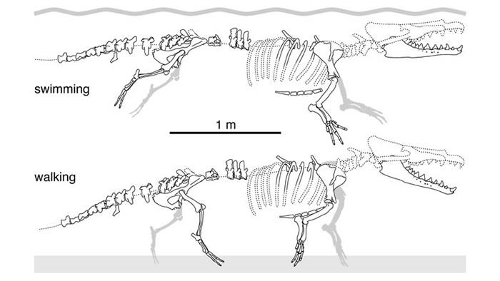 在秘鲁发现的四足鲸类有一条尾巴,其中第一条椎骨类似于其他两栖哺乳动物,包括水獭和海狸。据研究人员说,鲸类的祖先可能以类似的方式游泳。