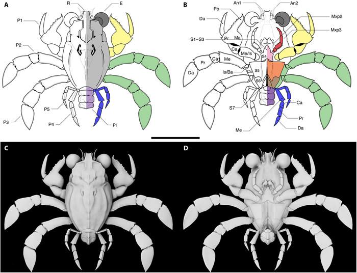 古螃蟹的四肢呈叶状,适合游泳(类似的四肢以前只有大约2.5亿年前消失的海蝎子才有)。 解剖学以前未知的成年螃蟹类似于十只脚的甲壳类生物和它们之后的幼虫。