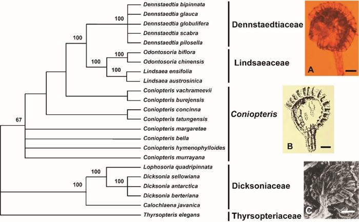 结果显示,锥叶蕨属与碗蕨属Dennstaedtia Bernh.、鳞始蕨属Lindsaea Dryand.、乌蕨属Odontosoria Fée具有较近的亲缘关系,而与它目前所属的蚌壳蕨科中的Calochlaena (Maxon) M. D. Turner & R. A. Whihte、蚌壳蕨属Dicksonia L’Hér.、Lophosoria C. Presl的亲缘关系较远。支序分析的结果表明相对于树蕨类植物蚌壳蕨科而言,锥叶蕨属与水龙骨类植物的亲缘关系更近(尤其是现生碗蕨属),因此提议将锥叶蕨属归于水龙骨类植物的基部类群。另外,研究人员对锥叶蕨属植物的古环境和古气候进行了讨论。