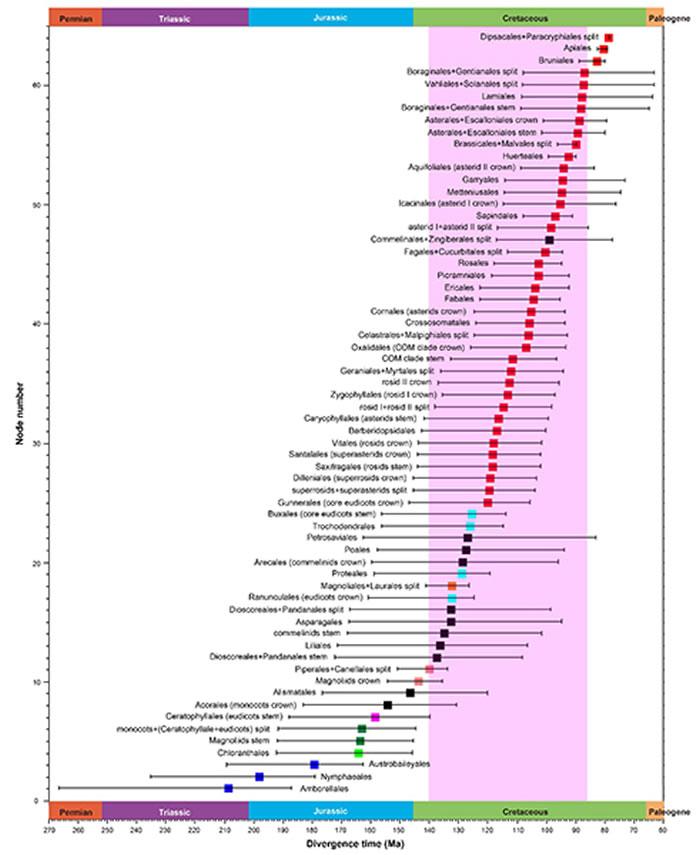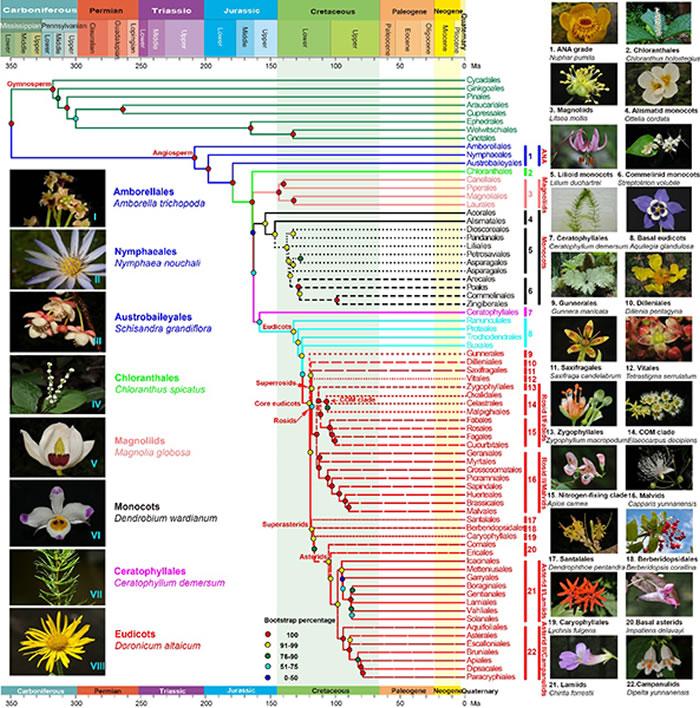 中国科学院昆明植物研究所李德铢研究员带领的研究团队,多年来致力于植物系统发育基因组学的研究。研究团队依托国家重大科技基础设施“中国西南野生生物种质资源库”,通过跨越亚洲、北美洲、欧洲、非洲和大洋洲的国际合作和院内、所内协同攻关,开展了迄今为止科级水平最广泛取样的被子植物系统发育基因组学研究。该研究选择被子植物全部64个目,涵盖85%现存科的2351个代表种,以裸子植物163种作为外类群,利用2881个质体基因组的80个基因重建了被子植物高分辨率的质体基因组系统发育树(Plastid Phylogenomic Angiosperm tree, PPA tree)。在此基础上,选择了62个化石校准点,估算了被子植物科级以上主要分支的分化时间。研究表明,被子植物起源于三叠纪晚期的瑞替期(Rhaetian,~209 Ma:267-187 Ma,95%HPD),明显早于确切的被子植物冠群最早化石年龄,并据此首次提出了被子植物化石记录与分子钟推算时间之间的“侏罗纪空缺(Jurassic gap)”。此外,核心被子植物五大分支,即金粟兰目(Chloranthales),木兰类(magnoliids),单子叶植物(monocots),金鱼藻目(Ceratophyllales)和真双子叶植物(eudicots)之间的关系仍然没有完全解析,暗示在被子植物早期分化阶段可能发生了辐射分化,或许发生了一定规模的灭绝事件,由此产生了令人困惑的“达尔文之谜”。自三叠纪晚期到晚白垩纪,被子植物的兴起、分化并逐渐取代裸子植物在陆表植物中占据主导地位,极大地影响了昆虫、两栖动物、哺乳动物、蕨类植物,以及许多其它生物类群的多样化进程。