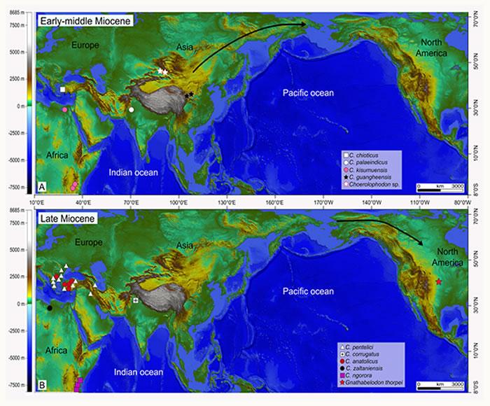 豕脊齿象类在中新世的分布位置以及洲际之间迁移示意图 (A, 早—中中新世;B, 晚中新世)(李春晓 供图)
