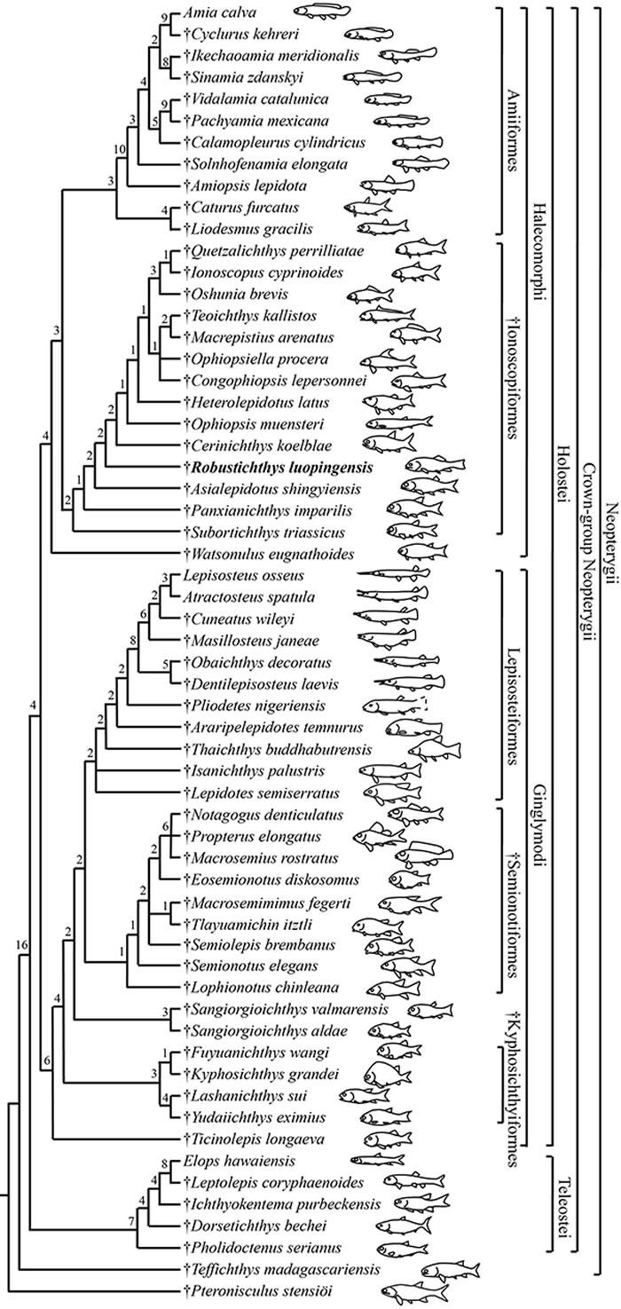 全骨鱼类分为铰齿鱼类和近鲱形类,分别以雀鳝和弓鳍鱼为现生代表。由于全骨鱼类与真骨鱼类(现生脊椎动物中最大的类群)的姐妹群关系,全骨鱼类在新鳍鱼类乃至整个辐鳍鱼亚纲的研究中具有举足轻重的地位。罗平强壮鱼是云南罗平生物群中体型最大的一种全骨鱼类,全长可达40厘米,发现于云南罗平中三叠世安尼期(2.44亿年前)海相地层。现已查明,它也是世界范围内中三叠世(距今2.37-2.47亿年前)地层中所发现的最大的全骨鱼类属种,对于重建三叠纪海洋脊椎动物生态环境无疑具有重要的潜在价值。自2014首次报道并命名以来,罗平强壮鱼成为全骨鱼类研究中备受关注的化石物种。然而,不尽如意的是,因为最初化石数量较为稀少,一些关键的骨骼特征不清楚导致罗平强壮鱼在全骨鱼类中的系统分类位置成为争论不休的问题。一些研究者认为它是近鲱形类的成员,但另外一些研究者将它归入铰齿鱼类。