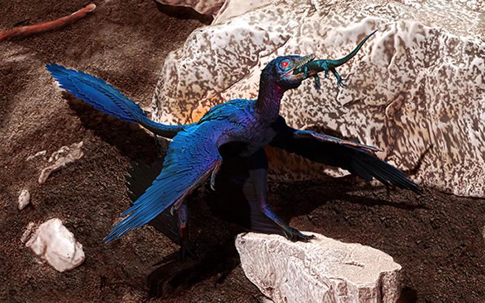赵氏小盗龙吞食王氏因陀罗蜥复原图(邹晶梅供图)