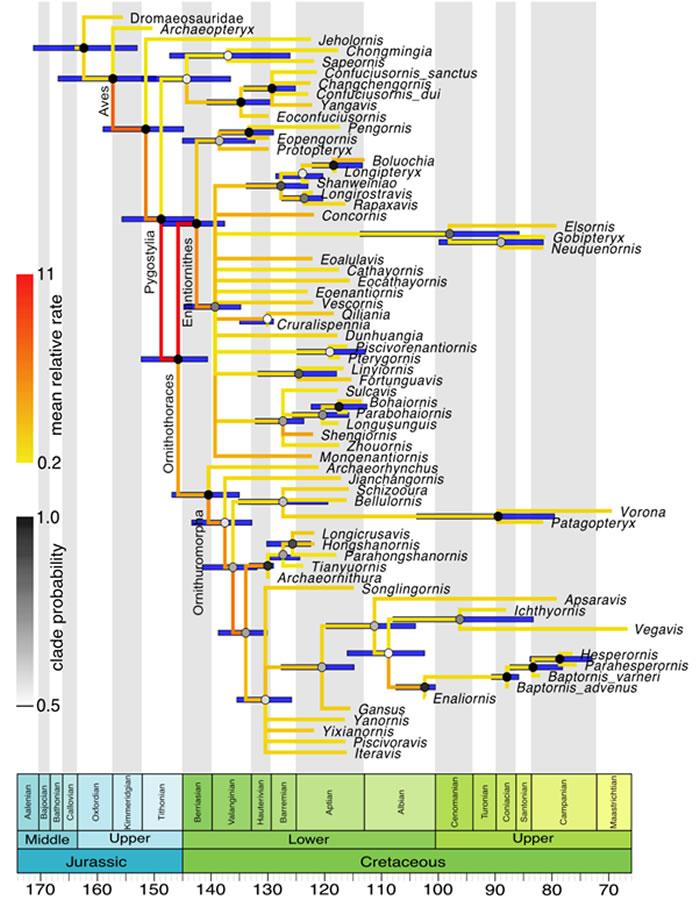 中生代鸟类的系统发育关系、分化时间和演化速率(张驰供图)