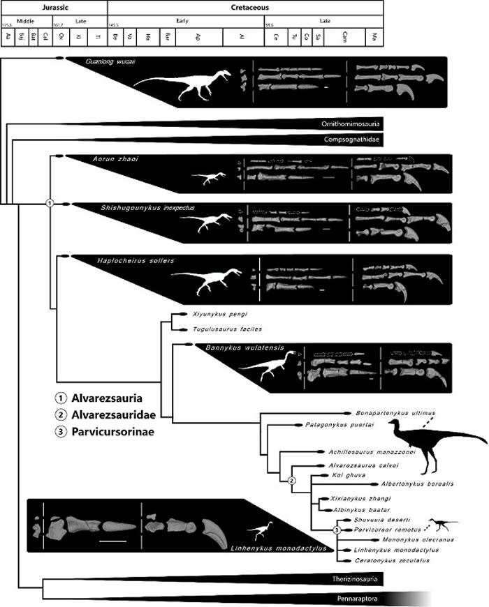 幸运的是,来自中国西部中晚侏罗世到早白垩世的化石记录,包括灵巧简手龙、赵氏敖闰龙、乌拉特半爪龙、彭氏西域爪龙等,逐步填补了阿尔瓦雷斯龙类演化历史中的大段空白。继这一系列重要发现之后,中国科学院古脊椎动物于古人类研究所徐星研究团队又于今日在《科学报告》(Scientific Reports)杂志发表了关于阿尔瓦雷斯龙类的最新研究成果,报道了又一件基干的阿尔瓦雷斯龙类化石标本。