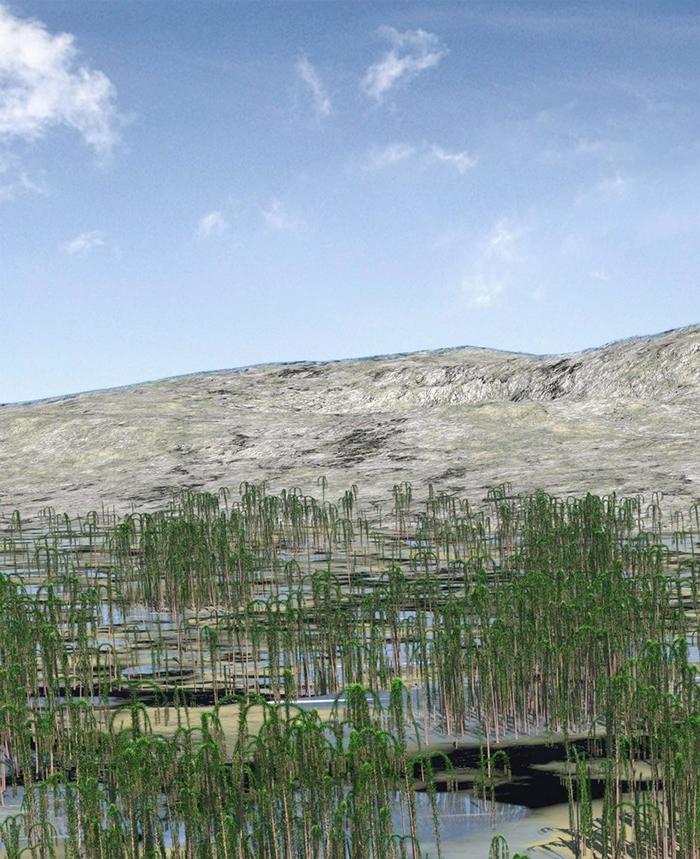 新杭镇发现的古代森林的特色在于其中的树,它们像竹竿一样笔直往上长,茎部缀着狭窄叶片。 一旦成熟,树顶就会分裂成带有下垂枝条的树冠,每一枝条都挂着装满孢子的圆锥。 IMAGE BY DEMING WANG