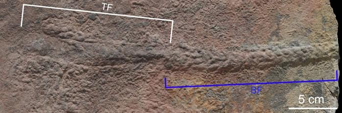 穗状夷陵虫化石(BF)和死亡前形成的遗迹(TF)。