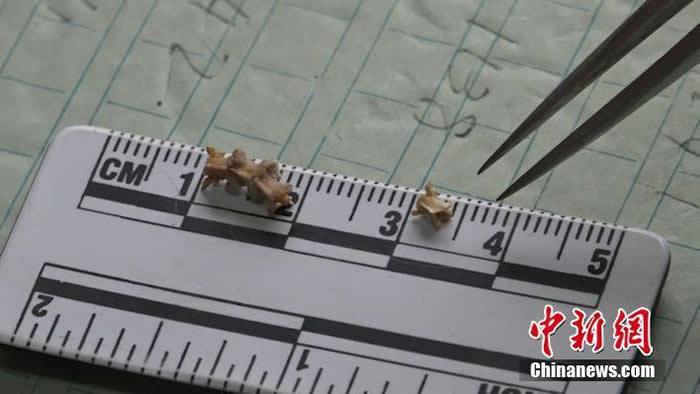 西北大学教授李永项:2012年的3月份拿到这些标本,到七八月吧,到下半年我就基本上都鉴定出来了,有许多哺乳动物,包括老鼠啊,兔啊,鸟啊,这样一些东西。也有一些爬行类,当时是看到只是把它编为爬行类,具体是什么,就是还没有详细地在做,当时是放在爬行类里面,非常小,像这个蛇的也就是一个骨节,就是蛇的脊椎,一节长度也就是3毫米左右。