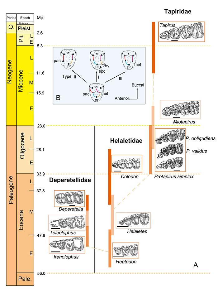 通过对头骨和腕骨材料的详细描述和比较,研究者认为其代表了目前已知最原始的戴氏貘,并命名了新属种:齐氏二连脊貘(Irenolophus qii)(图1),种名献给曾在二连盆地进行过大量野外和研究工作的齐陶先生。研究者同时认为戴氏貘和貘科一样,很可能都是从原始的沼貘类一支演化而来。这主要表现在戴氏貘和早期的沼貘上臼齿都具有退化且向舌侧挤压的后尖,下臼齿趋于双脊形,以及前颌骨不退化,与鼻骨接触等。根据对下臼齿釉质显微结构的分析,二连脊貘具有垂直型的施氏明暗带,且釉柱中具有明显的中缝(图2)。另外,戴氏貘的前臼齿臼齿化模式也显示出非常独特的特征(图3)。大多数奇蹄类在演化的进程中,前臼齿都有逐渐臼齿化的过程,即早期的类群中前臼齿通常结构较为简单,后期的逐渐复杂,和臼齿的形态接近。这一臼齿化过程通常是从原尖向后伸出一条脊,从而分化出次尖而实现(如沼貘科、貘科,和其他大部分奇蹄类);而在戴氏貘中,臼齿化的过程是通过前小尖和原尖的逐渐分离而形成;这一模式以前仅见于始新世马类的P3和貘犀Metahyrachyus的P2。所以戴氏貘的进步类群Deperetella和貘科中Tapirus前臼齿虽然都已经完全臼齿化,但它们对应的舌侧齿尖和两条横脊并不是同源结构。而两栖犀类的前臼齿臼齿化是通过原尖和后小尖分离而形成的。这三种模式说明了不同类群奇蹄类前臼齿的臼齿化具有不同机制,而这些不同机制产生的原因和影响仍需进一步的研究工作。