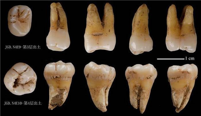 原生地层中出土2枚早期现代人牙齿化石,分别发现于第4层和第3层。另在早年被人工搬运至洞外的、含石制品和动物化石的堆积中筛洗发现人类牙齿4枚、头骨残块3块,这些筛洗出土的人类遗骸石化程度多与原生地层中出土的人类化石相当。
