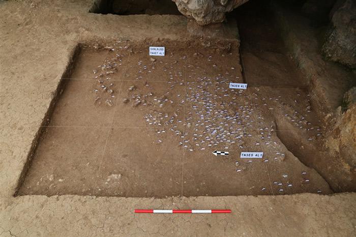 第三期遗存为第5-3层,堆积为浅黄棕色粉砂,夹较多灰岩角砾。发现人类活动面1处、石器加工点3处、火塘2处;出土人类化石、石制品、烧骨、动物化石等遗物万余件,遗物分布十分密集。王社江说:“这一时段是人类活动的繁盛期,洞穴被人类作为居址长期利用,绝对年代为距今约3-1.5万年。”