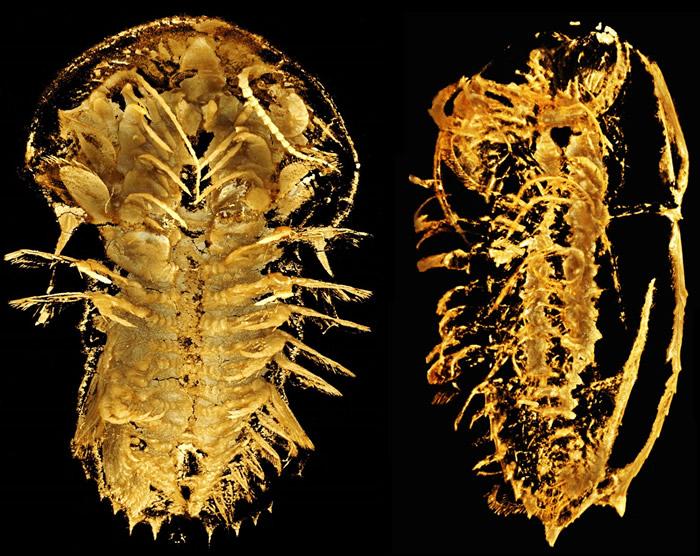 寒武纪澄江生物群中不同发育阶段的刺状纳罗虫化石的显微CT成像。左:幼虫,体长11毫米;右:成虫,体长31毫米。修改自Zhai et al., 2019, Proceedings of the Royal Society B (Biological Sciences)。
