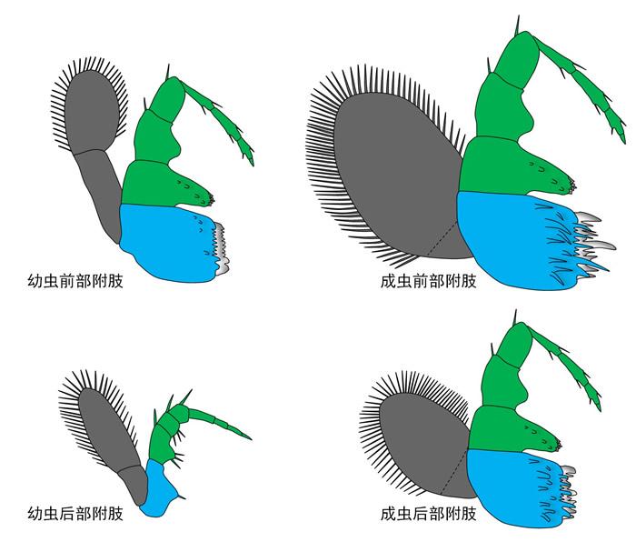 研究人员观察到,幼虫身体后部的附肢,其原肢较小、内侧较为光滑;身体前部附肢的原肢则特化为“颚基”结构,其内侧具有两列整齐排列的小突起,用于研磨较小、较软的食物颗粒,如藻类、有机碎屑等。成虫的颚基则有多排发达的刺,尤其是在靠近口部的附肢上,这些刺状结构十分发达、十分尖利。它们大小不一、错落有致地排列着,可以有效地撕碎食物,比如带壳的生物、其它动物的肢体等。