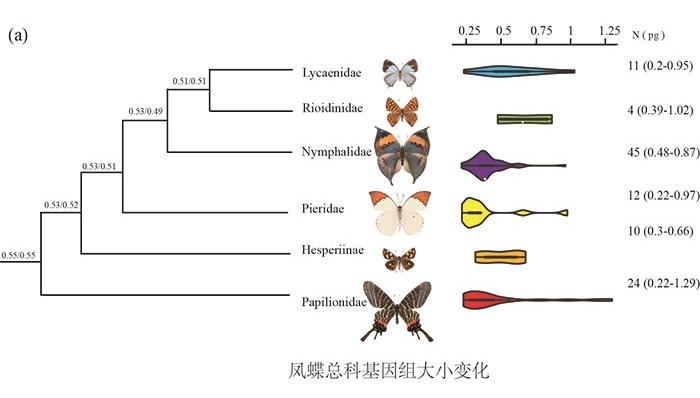 研究团队在2015年完成所有蝴蝶模式种金凤蝶及其近缘种柑橘凤蝶两种凤蝶基因组,及以蝴蝶为例首次实现野生昆虫的基因编辑(Li et al., 2015, Nature Communications)。在此基础上,为了在蝴蝶系统发育的更大尺度下更好的探讨蝴蝶形态等表型多样性进化的遗传基础,于2017年启动了蝴蝶谱系基因组计划。作为蝴蝶谱系基因组计划的第一步和基础,该团队利用流式技术测定涵盖中国分布所有科和几乎所有亚科共67种蝴蝶的基因组C值,并利用二代测序技术对其线粒体基因组进行组装,其中1亚科23属59种的线粒体基因组为首次报道。结合公共数据库中的基因组大小和线粒体基因组数据,构建了6科29亚科145属264种蝴蝶的蝴蝶系统发育树,并在此系统发育框架上探讨了6科24亚科71属共106种蝴蝶基因组大小的进化。研究结果表明,蝴蝶的基因组大小在0.203pg(199Mb)(蛱蝶科:Heliconius xanthocles)到1.287pg(1253Mb)(凤蝶科:Parnassius orleans)之间,差异达6.4倍;科内差异最大的是凤蝶科(5.9倍:0.22-1.29pg),其次是蛱蝶科(4.8倍:0.2-0.95pg)、粉蝶科(4.4倍:0.22-0.97pg)、灰蝶科(2.6倍:0.39-1.02pg)、弄蝶科(2.2倍:0.3-0.66pg)和蚬蝶科(1.8倍:0.48-0.87pg)。研究结果还表明,蝴蝶的祖先基因组大小约为0.5pg,不同亚科或族的某些祖先基因组大小的增减事件导致了现生蝴蝶基因组大小的多样性变异。这些研究结果不仅为蝴蝶基因组大小的进化提供了新见解,而且也为未来的基因组测序计划提供了重要的参考。该研究以Genome size variation in butterflies (Insecta, Lepidotera, Papilionoidea): A thorough phylogenetic comparison为题,于2020年01月7日在昆虫学顶尖期刊Systematic Entomology在线发表。网站链接https://onlinelibrary.wiley.com/doi/full/10.1111/syen.12417。
