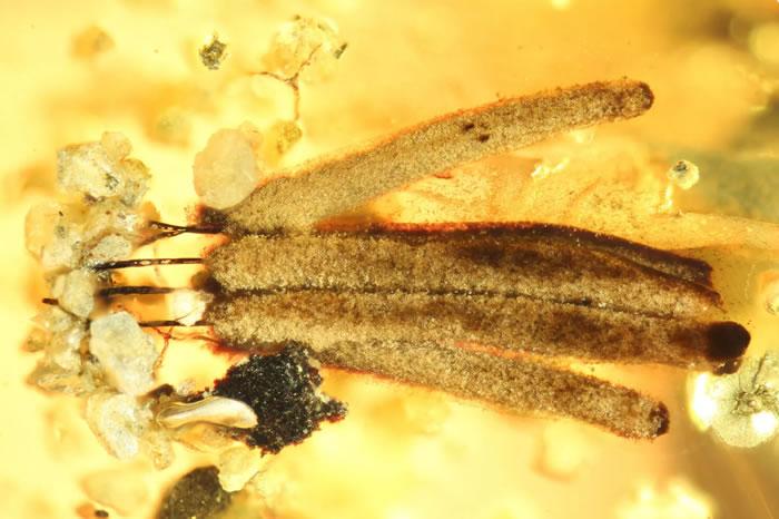 微生物产生粘液菌(也称为粘菌)是单细胞生物。哥廷根大学科学家表示: “它们可以结合在一起,形成复杂、美丽和精致的子实体,这些子实体可以制造和传播孢子。” 琥珀中展示的是就是这些子实体。