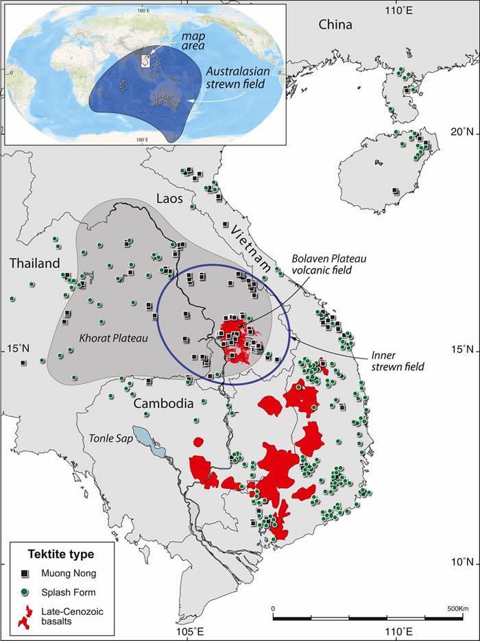 (化石网报道)据cnBeta:一个多世纪以来,学界一直猜测在大约79万年以前,有一枚宽度达到1.2英里(1.9公里)的陨石撞击了地球,并在东半球20%的区域散布着黑色的“玻璃状斑点”。尽管许多人都认同这一理论,但可惜长期未能找到这枚庞然大物的着落点。现在,一支科学家团队给出了新的预测,指出其陨坑或位于东南亚国家老挝的南部 —— 该地区现被称作Bolaven高原。