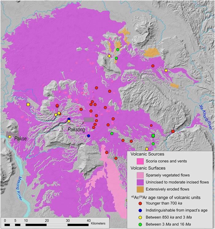 科学家写道:“我们提供了地层、地球化学、地球物理、以及地球年代学等证据,证明直径约15公里的火山口被埋在老挝南部一个年轻的大火山场之下” 。