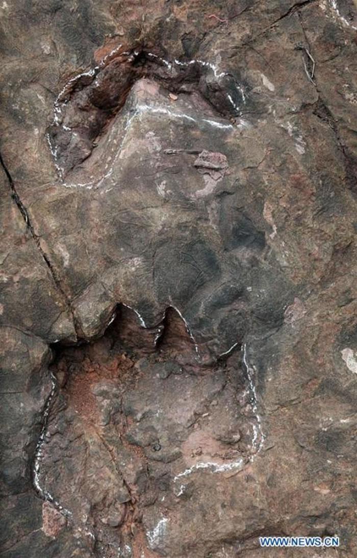 资料图:中国西南部贵州省茅台乡一家酒厂的施工现场发现的侏罗纪早期恐龙脚印化石。