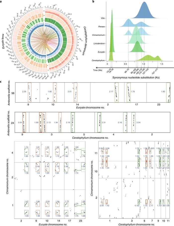 (化石网报道)据华北理工大学(生命科学学院供稿):2月24日,华北理工大学王希胤教授与四川大学、兰州大学以及哈佛大学研究人员共同在《自然-植物》(Nature Plants)杂志上发表题为“芡实和金鱼藻基因组揭示被子植物早期进化(Prickly waterlily and rigid hornwort genomes shed light on early angiosperm evolution)”的论文,对两种水生植物-芡实和金鱼藻-进行了基因组测序,装配出染色体水平的基因组序列,通过与其它代表性陆生植物基因组进行深入比较分析,揭示了被子植物生命之树的关键部分。