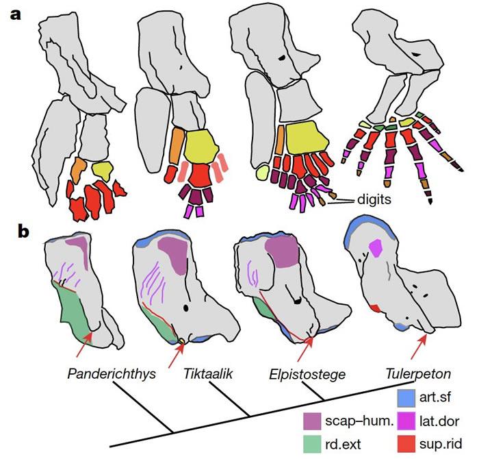 骨骼残骸显示,四足动物的形象大约出现于3.74亿年前,但是一些较古老的化石包含四肢样的骨骼,可能暗示四足动物起源甚至更早。在此之前,脊椎动物向陆地拓展的演化记录一直主要依靠少数来自中晚泥盆世(3.93亿~3.59亿年前)的四足动物样希望螈目化石。但是,这些化石无一揭示了胸鳍的完整骨骼结构。