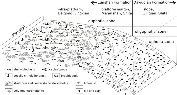 安徽南部早奥陶世特马豆克阶仑山组的叠层石的古地理分异示意图