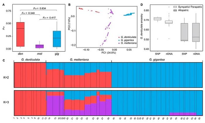 小黑桫椤(G. metteniana)与其亲本大叶黑桫椤(G. gigantea)和粗齿桫椤(G. denticulata)的遗传分化