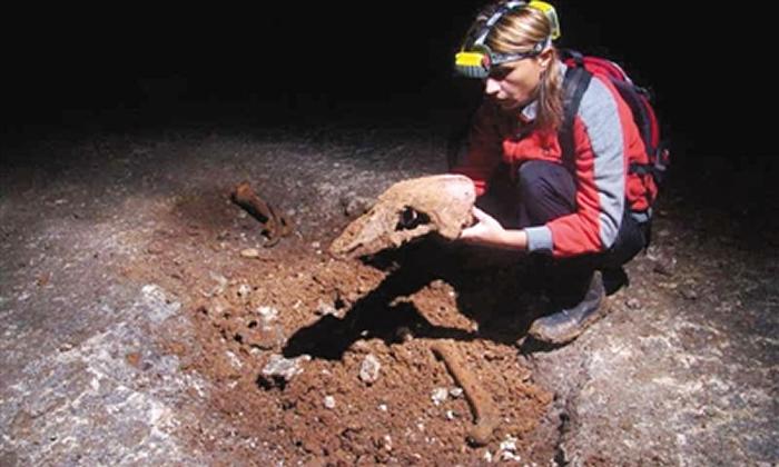 研究人员考古发现的洞熊头骨比现有棕熊头骨大很多 图片来源:《科学进展》网站