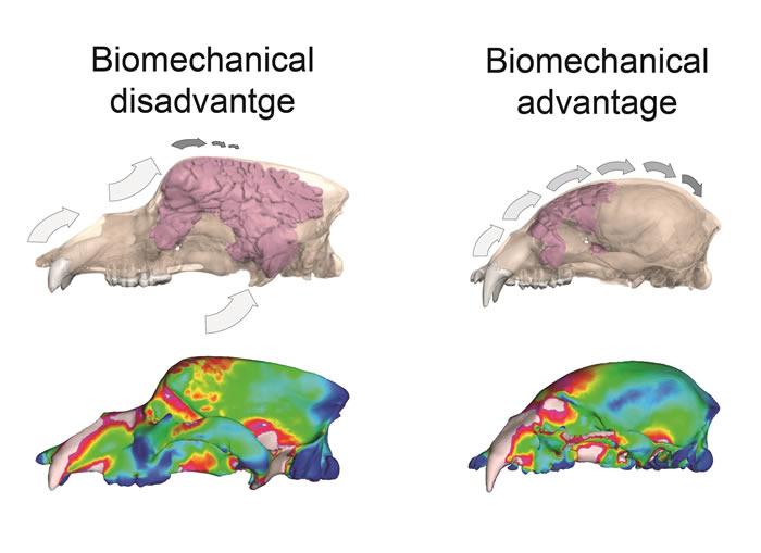 研究团队扫描了4只洞熊和8只现生棕熊的头骨,比对发现洞熊的鼻窦出奇地大,而鼻窦直接影响了咀嚼方式、力度和幅度。因鼻窦变大,洞熊面颅骨和头盖骨出现变形,原本圆形的头顶变得扁平,而且不断向后延伸,犬齿、门齿的咬合力也因此变弱。随着时间推移,它们无法使用门齿和犬齿将肉食撕裂食用,只能依靠臼齿将植物研磨碎吞咽。因此当草不够吃的时候,它们也就无法转而以肉类为食。